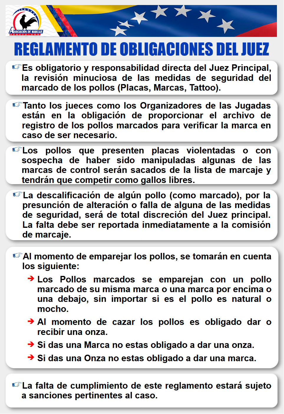 Para esto se marcan los pollitos en su edad temprana todos los meses asi garantizar, junto a los demas criterios (Peso, espuelas y edad), que las peleas se realizen lo mas pareja posible.